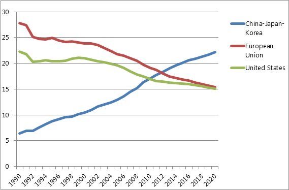 人類はいま、自分たちの将来の有無を決するこれからの20年について、真剣に考える必要がある。図3が示すように、世界経済においては東アジアが成功のカギとなるだろう。点線は EU の、薄い実線は米国のシェアだが、唯一、上昇傾向にある実線は、日本、中国、韓国の3カ国国内総生産(GDP)を合算したものだ。