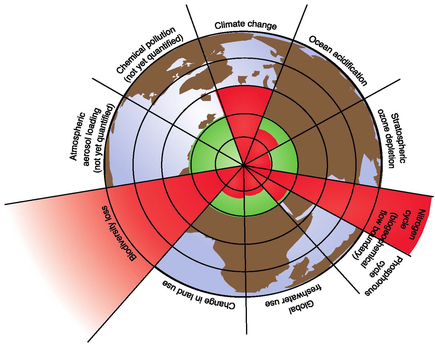 環境面での最大の脅威は、世界経済の動力として燃やされる石炭、石油、ガスから排出される二酸化炭素(CO 2 )などによる温室効果ガスの濃度上昇が引き起こす気候変動だ。ほかにも、淡水資源の枯渇、窒素やリン系化学肥料による河川の汚染、生息地破壊、生物多様性の喪失、海洋資源の乱獲や海洋の酸性化といった問題もある。