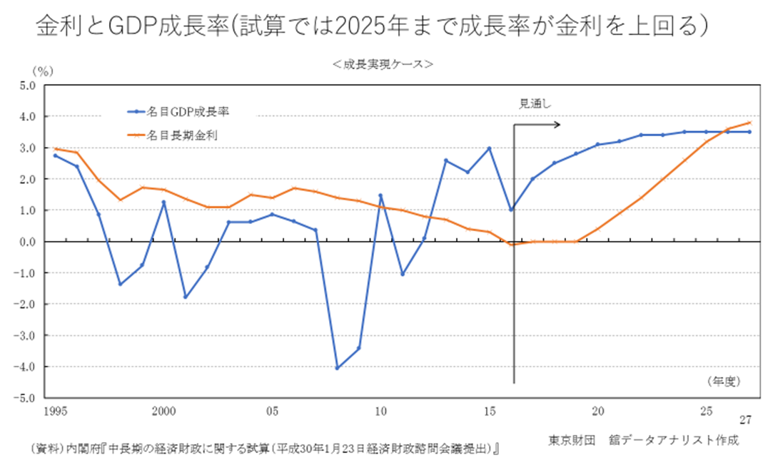 第2に、金利と経済成長率の関係が、あまりにも人為的であるという指摘である。図表は、金利と名目経済成長率との関係を見たもので、双方の関係は、中期的にはほぼ同水準になるのが常識だが、「推計」では、2025年まで成長率が金利を上回ることとなっている。