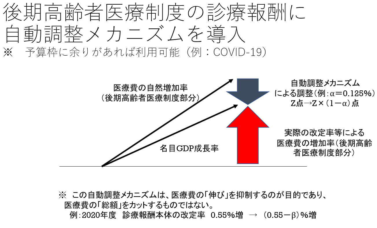 すなわち、医療版マクロ経済スライドとは、後期高齢者医療制度の医療費が予算枠を上回る分を診療報酬の自動調整により予算の枠内におさめる方式であり、コロナ危機などの影響により、診療報酬の自動調整を発動せずとも、後期高齢者医療制度の医療費が予算の枠内を下回る際には、危機時の対応として、その余った財源を後期高齢者医療制度の追加予算として利用しても構わない可能性が出てくる。