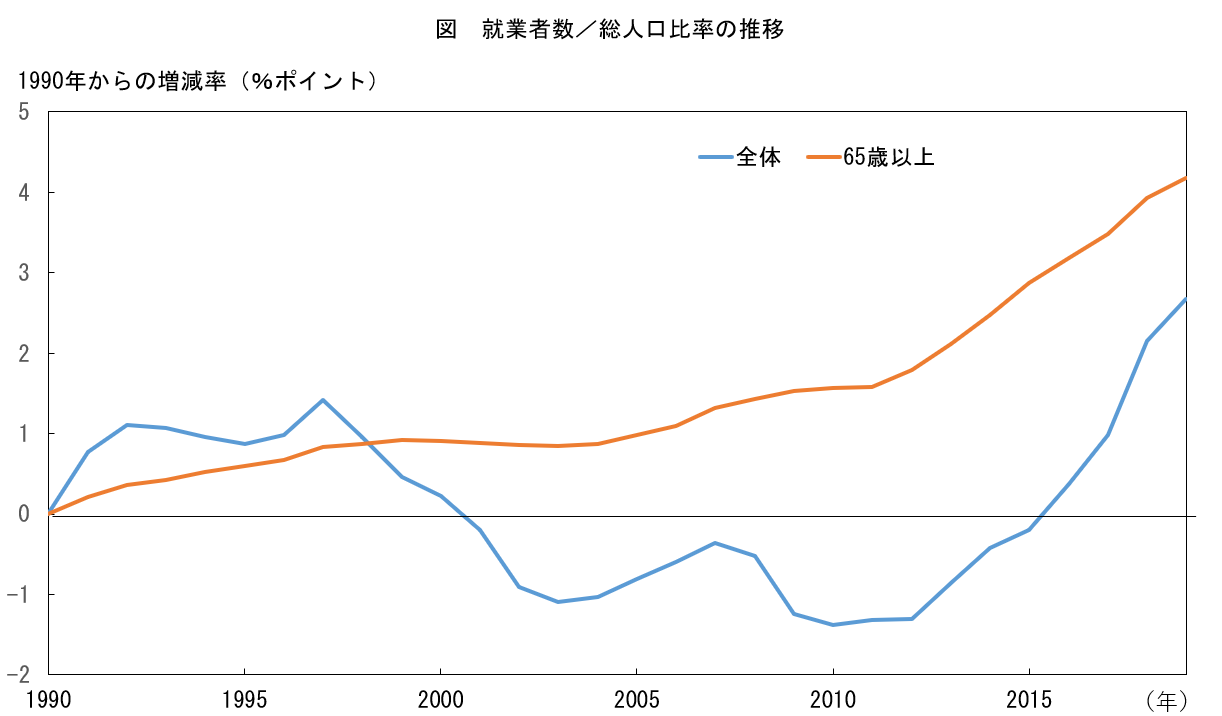 実は、全体の支え手はここ数年、増加傾向を見せている。図は、バブル崩壊が始まった1990年以降において、まさしく社会の支え手である就業者が総人口に占める比率がどのように変化したかを調べたものである。社会全体の就業率は、2000年代初めから半ばにかけて1990年の水準を下回って推移したが、その後はアベノミクスが奏功したこともあって回復している(現在の比率は53.2%)。一方、65歳以上の高齢就業者数/総人口比率は一貫して上昇しており、社会全体の就業率の上昇を牽引してきたことも分かる(現在の水準は7.1%)。もちろん、そのかなりの部分は短時間労働者など非正規雇用者であり、その効果は割り引いて考える必要がある。しかし、社会の支え手としての高齢者の役割が高まってきたこと自体は歓迎すべきである。