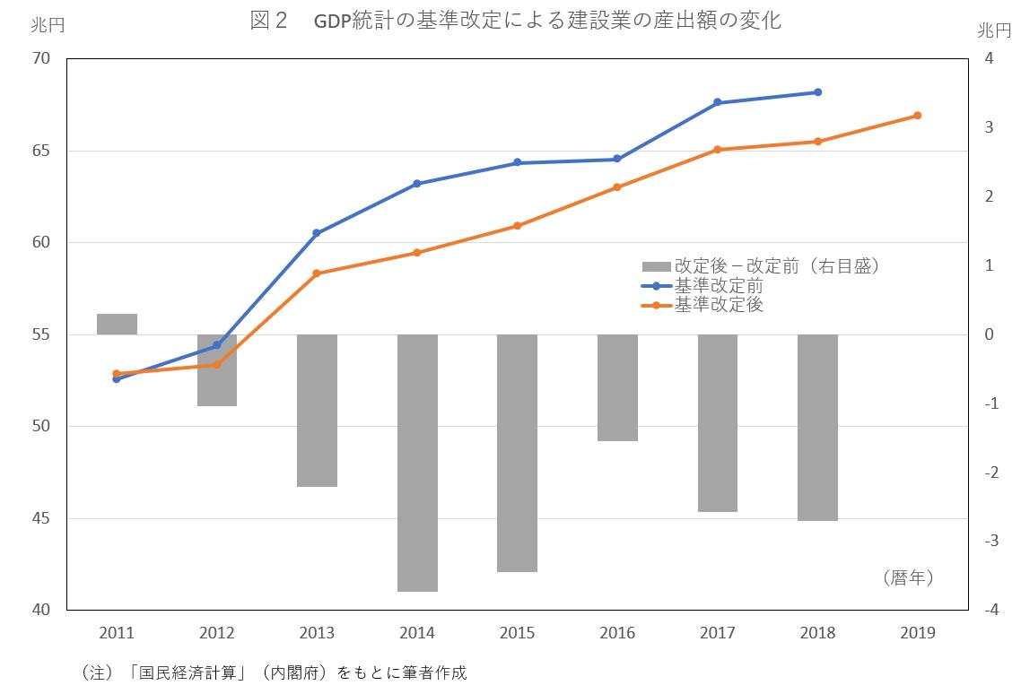 さらに、GDP統計は2020年12月に基準改定が行われ、遡及改定されている。この基準改定では、2015年の産業連関表の情報を取り込んだが、この産業連関表から得られる建設業の産出額の2011~15年にかけての伸び(建設投資額の伸びとも考えられる)が、基準改定前のGDP統計における建設業の産出額の伸びを大きく下回っていることが判明した。建設業の産出額は、基本的に建設総合統計の出来高の伸びを用いて推計されている。