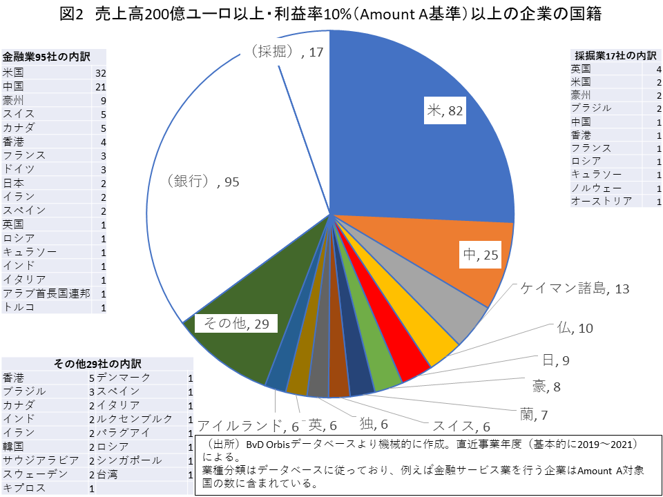 それでは、新課税ルールとそこからの除外のインパクトはどうか。国税庁やOECDが利用しているものと同じデータベース(Orbis)に収録された直近の財務諸表データに基づいてこの課税の対象となる企業を機械的に抽出すると、200余の多国籍企業が該当する(図2)。内訳は、米国の82を筆頭に、中国25、ケイマン諸島13など続く。