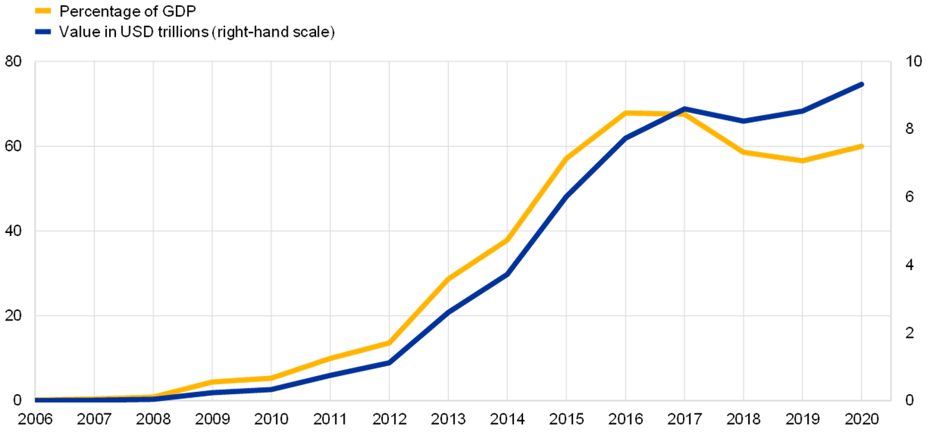 図1に示したのは欧州中央銀行(ECB)が試算した中国のシャドーバンク取引の金額のGDP比である。2016年以降、シャドーバンク取引の伸びこそ横ばいになっているが、依然として高い伸び率になっている。これらのシャドーバンク取引の多くはうなぎ上りだった不動産市場に投じられているが、2020年コロナ禍が起きて、不動産市場の伸びは鈍化するようになった。とくに、恒大集団のような大手デベロッパーはデフォルトを引き起こし、不動産バブルの崩壊が囁かれている。