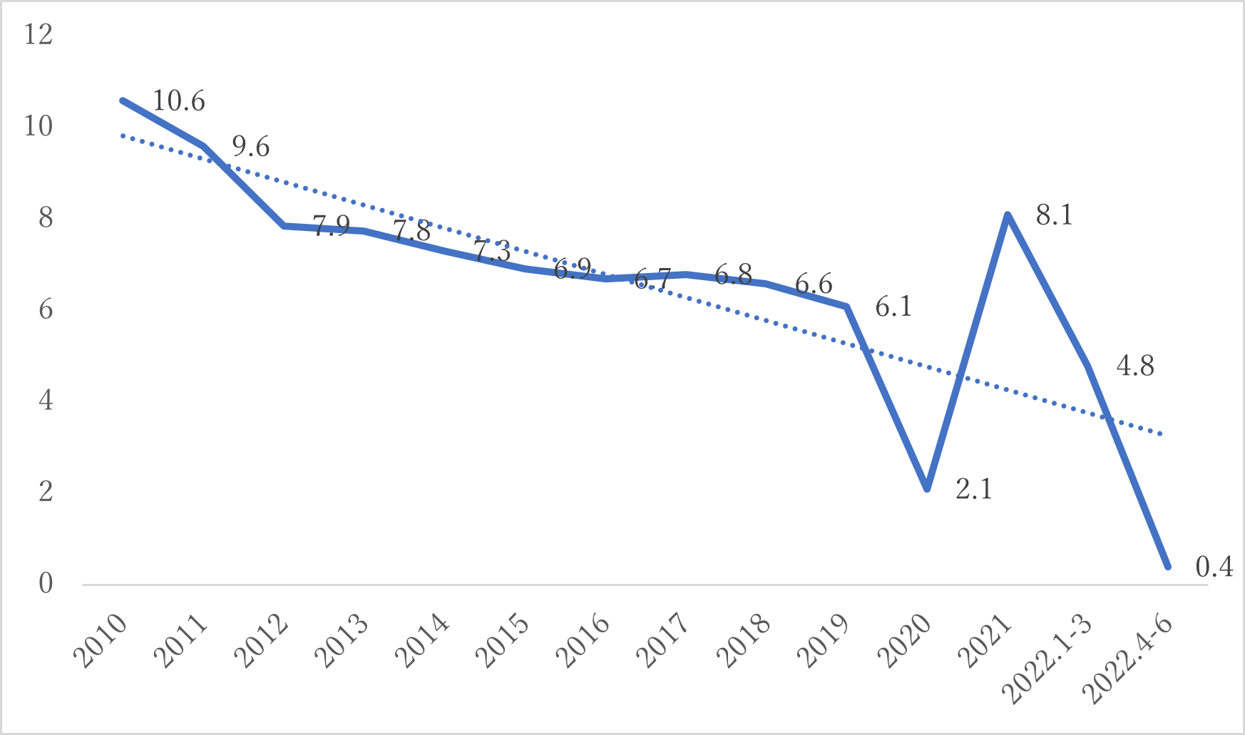 図3 中国実質GDP伸び率の推移(2010-2022年第2四半期)